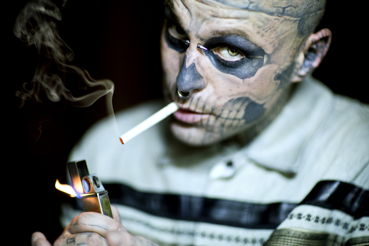 You might recognize Rick Genest better known as Zombie Boy (or Rico the Zombie) from the Lady Gaga Born This Way video. Or maybe you’ve seen his fashion modeling work (he’s the face of Jay Z‘s clothing line Rocawear in Europe- and the face of Dermablend Professional).