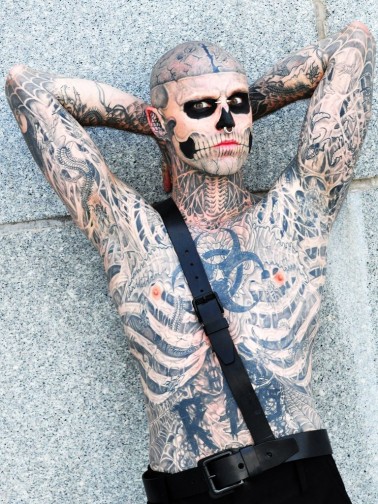 If it’s possible to imagine, Zombie Boy has expanded his career from beyond being just a male runway model. He was featured in a promotional video for Dermabrand Professional makeup entitled, “Go Beyond the Cover”, in which they completely cover his body with makeup, effectively making him tattoo-less. The video almost instantaneously went viral. Zombie Boy became the first ever male spokesperson for L’Oreal based on the success of that campaign.